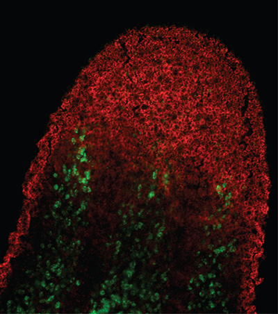 Figure 1. Ciliated epithelium (red) and other tissues of an adult planarian flatworm are maintained by the abundant stem cell population (green). Credit: Elizabeth Duncan, PhD, Sánchez Alvarado Lab, Stowers Institute for Medical Research.
